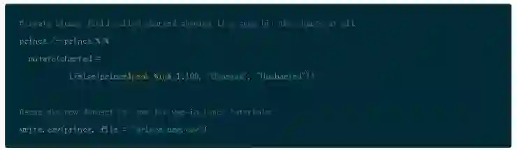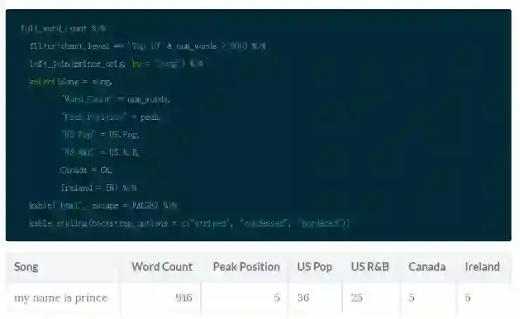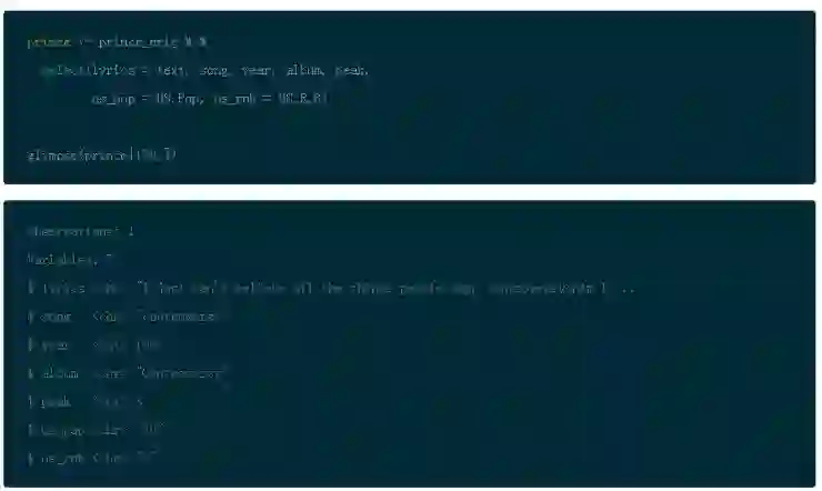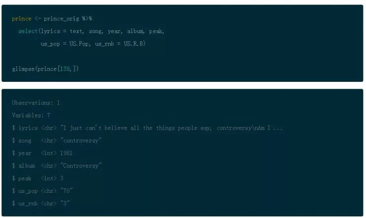 另外,注意的是,select() 允许你一次重新命名所有的列。因此将文本设置成歌词然后用_代替. 重命名 US 列项。然后存储为 Prince,之后再整个教程中你都将会用到。Dplyr 提供了一个函数叫 glimpse() 会使你在转置视图中更容易地查看数据。