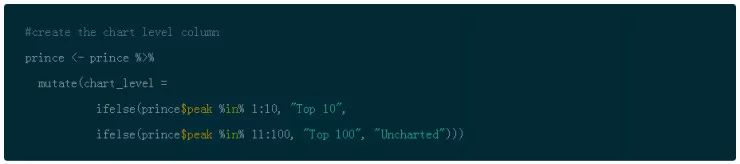 因为你的一个目标问题是寻找跨越时间的歌曲趋势,并且数据集包含着个人发行年份,你可以创建存储桶来以十年划分年份。使用 dplyr 的 mutate() 函数来创建新的 decade 项。创建存储桶的一个办法是采用 ifelse() 和 %in% 操作符来根据年份过滤歌曲转换成十年。然后存储结果到 Prince(实际是增加了一个新的项)