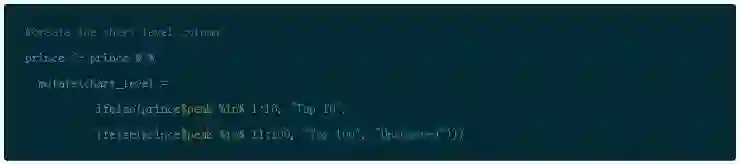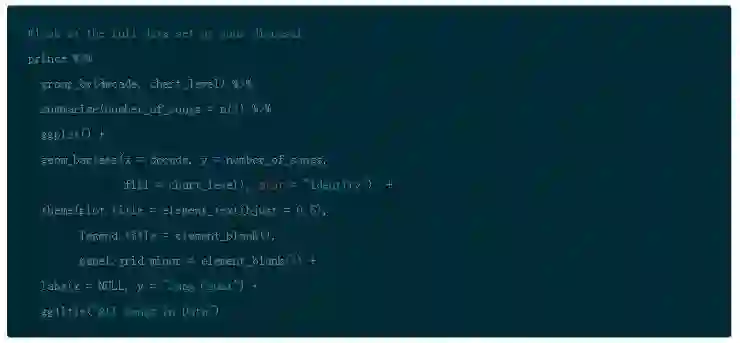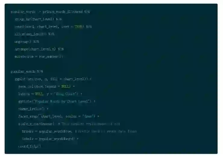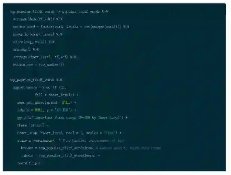 注意到下图代码中使用 slice(seq_len(n)) 的作用是为了获得 chart_level 不同类别的前几名。它的作用和 top_n() 是不同的,并且如果你在图形中使用刻面的话,这是更加方便的选择。(需要谨记这类技巧有不同方法)你可以使用 row_number() 函数来确保在图形中你可以按照正确顺序呈现单词)。ggplot() 默认设置是按照字母排序,并且实际操作中排序要优先于画图。