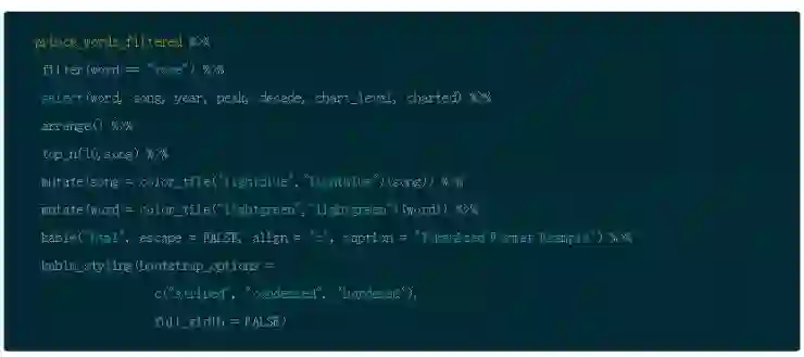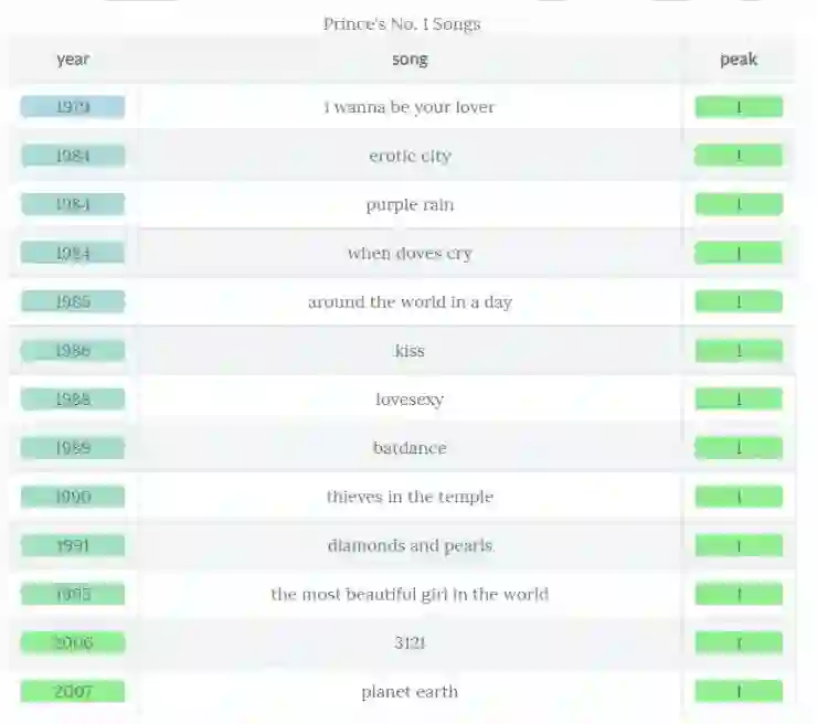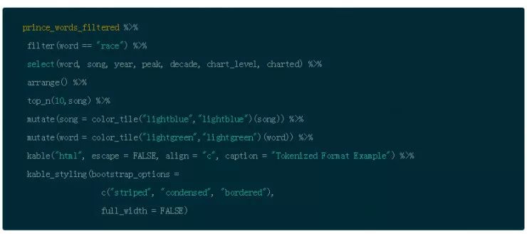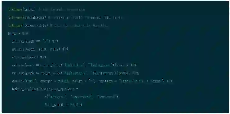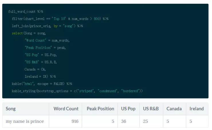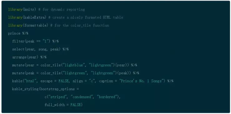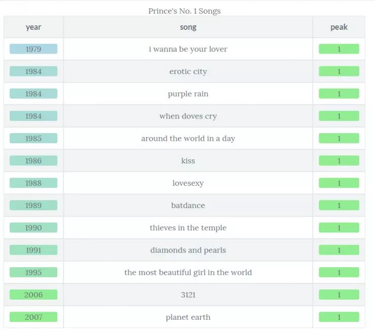 对于那些 Prince 狂热的粉丝来说,下面是一个快速浏览排行榜第一的歌曲(请注意,你可以用来自于 knitr 包的 kable() 和来自于 kableExtra 包的 kable_styling() 以及来自于 formattable 包的 color_tile() 来创建一个更规范的 HTML 输出)