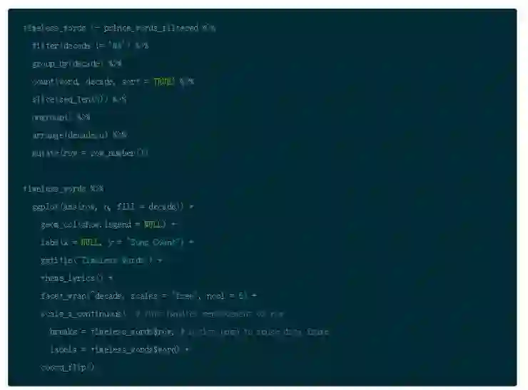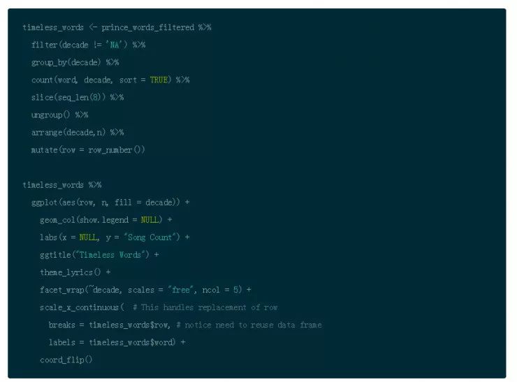 音乐中一些词汇是永不过时的。永不过时的词汇超越了时间,能够吸引一大批听众。如果你按照每十年划分你的数据,这些词汇会上榜。使用过滤,分组和聚合获得 Prince 歌词每十年的流行词汇,观察什么词汇属于永不过时的,哪些是一闪即逝的。你可以使用 ggplot() 中的 facet_wrap() 绘制每十年的数据。