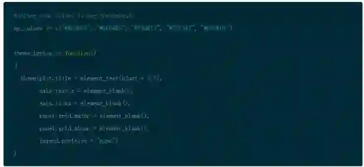 为了个性化图表,我喜欢创建一个唯一的颜色列来保持视觉的一致性。Web 上有很多可以通过下面所展示的十六进制码来获得不同的颜色的地方。如果你有对于图表有这样的喜好,你也可以在需要的时候通过使用 ggplot() 创建自己的主题。