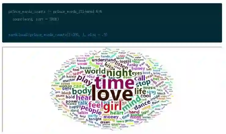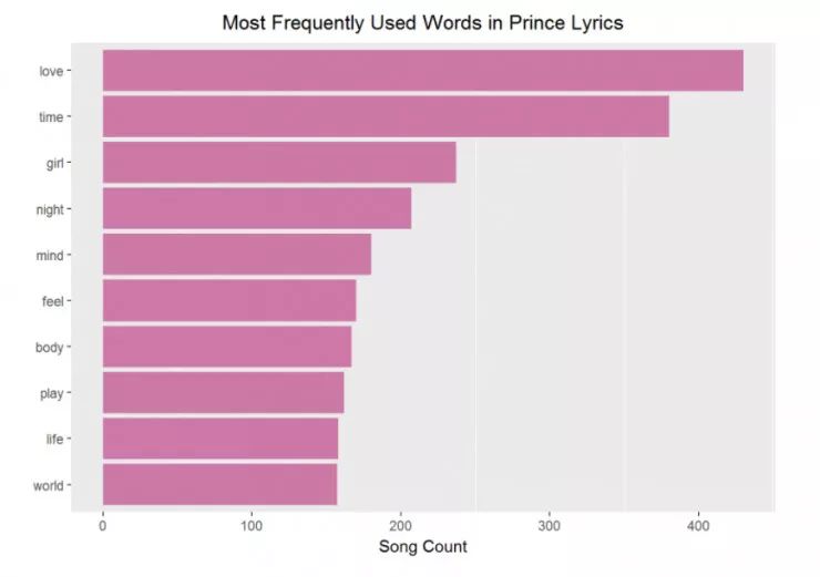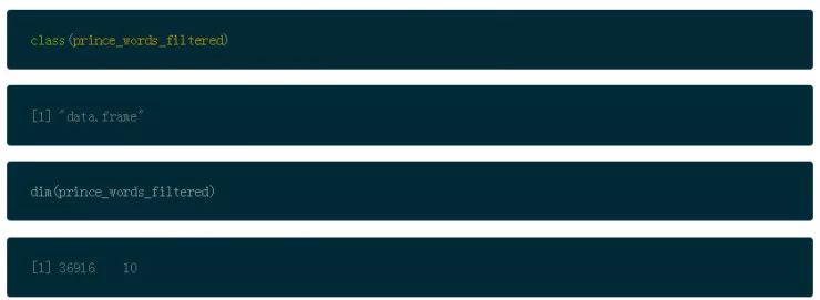 注意:为了之后的参考,prince_words_filtered 是 Prince 数据的整洁文本版本: 没有了停止单词,没有不想要的单词,没有 1-3 个字符的单词。你会在一部分而并不是所有的分析中使用它们。