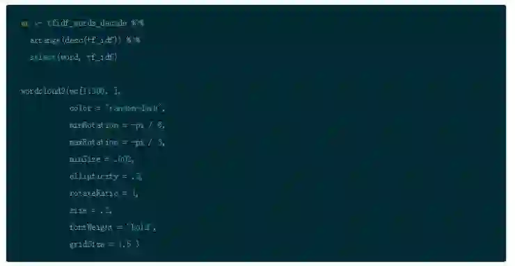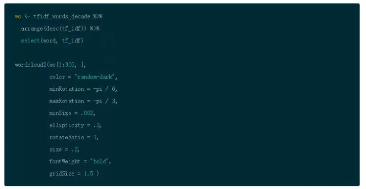 但是现在,使用一个新的、名为 wordcloud2 的包做一些酷的事情。这个包提供关于词云生成 HTML 控件的创造性的集合。你可以围绕一个单词观察其在文本的频率。(这个包在 rMarkdown 平台上面更新速率非常缓慢,并且对使用的浏览器有非常多的限制条件。希望它会有所提升。)