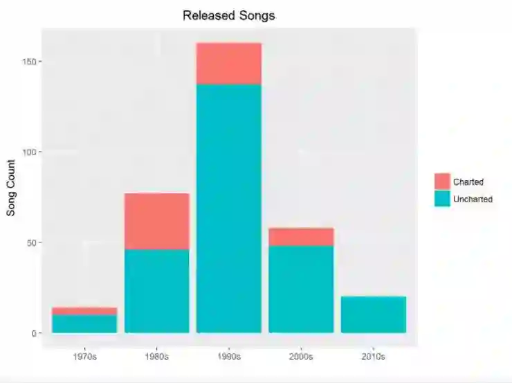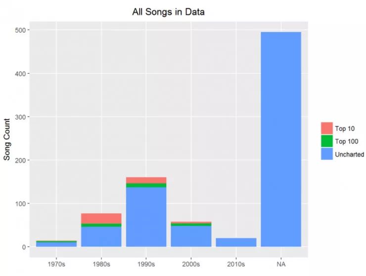 注意到所有 Prince 的上排行表的歌曲,大部分都是前 10 名。但是更有趣的是在他创作新歌最多产的十年是 90 年代,但是更多上排行表的是在 80 年代。为什么会发生这样的事儿?请在看文本挖掘部分的时候记住这个问题。
