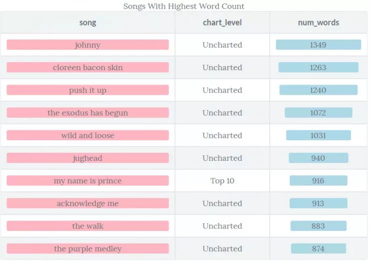 所有这三部分都将会使用相同的数据集,即 Prince 的歌词,发布年份,BillBoard 位置。 这次研究的技术也可以应用于其他类型的文本。事实上,标准散文的结果更容易解释,因为歌词一般常常是用间接的信息和细微的差别来设计的。