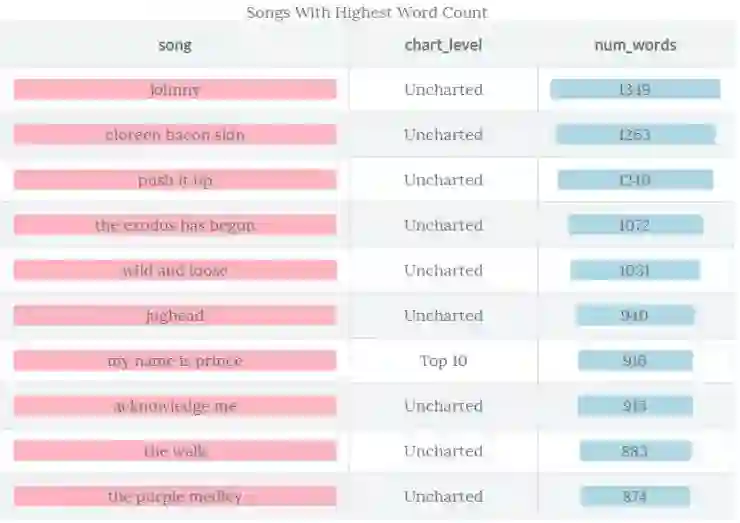 注意到上图是右偏的。考虑到歌词转录的性质,我怀疑是歌词输入的错误。所以,出自好奇,我观察打榜前十名且超过 800 个单词的歌曲。