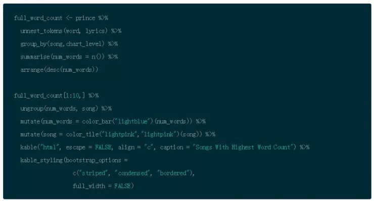 为文本挖掘获得数据的流行办法是使用 rvest 包来从网上搜取内容。我能够从不同的网站上搜取 BillBoard 信息和 Prince 歌词,并把他们加入到歌曲的标题中。因为不一致的标题命名约定,导致了一些争论。然后我做了一个主观的决定,去除了不是原版的所有歌曲,即混音,扩展版本,俱乐部混音,重制等等。为了避免重复,我还删除了收录了他热门歌曲的历史合集的专辑。我做了一些小清理,并保存结果为可以用于本教程的 csv 文件。