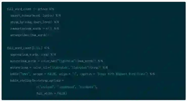 整洁文本:每行都有一个令牌的表。在本例中,令牌即一个单词(或者是在第二部分讨论的 n-gram)。标记化是一个将歌词拆分为令牌的过程。本教程将用 tidytext 的 unnest_tokens() 函数来完成。详细信息,请查阅 tidytext 文档。
