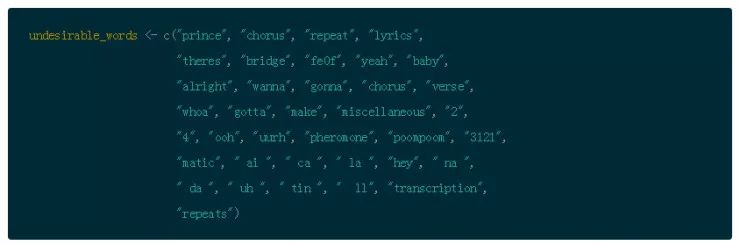 但是在你开始令牌化任何东西之前,清理数据还有一个步骤。很多歌词在转录的时候会包括像 “重复合唱” 或者 “桥牌”“诗歌” 等这样的标签。还有很多不希望的单词会弄脏结果。有了之前的分析,我选择一些可以摆脱的方法。