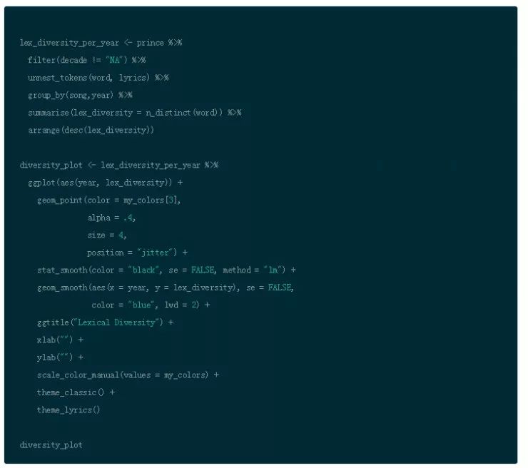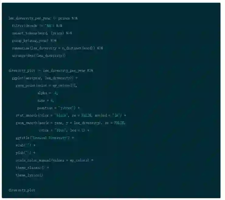 你可以观察到过去几年间,Prince 的词汇多样性和密度呈轻微上升趋势。怎样比较这个趋势和所有流行歌曲的关系呢?有研究显示打榜歌曲的词汇多样性和密度呈下降趋势,暗示重复性有所提升(例如:词汇更多,说得更少)。这个趋势和 Prince 的歌曲不同。另一个研究证明所有流行歌曲,多样性(独特词汇)在过去年间呈现上升趋势,这和 Prince 歌曲正相关。这可能是因为过去榜单排名试图丰富类型多样性。类型是数据的关键部分,但是这个变量在我们的数据集并不存在。这是否是因为榜单历史对流行歌曲的影响力日益衰微,对 R&B/Rap 的影响力日益加深?