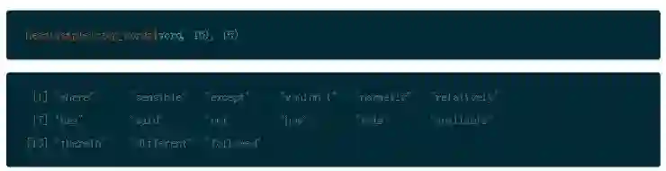 使用 sample() 展示一个这些停止单词的随机列表,使用 head() 限制在 15 个单词。