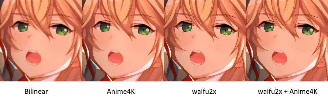 waifu2x前辈的效果,明显不及Anime4K,常见虚影。速度也有明显缺陷,每张图耗时超过1秒。