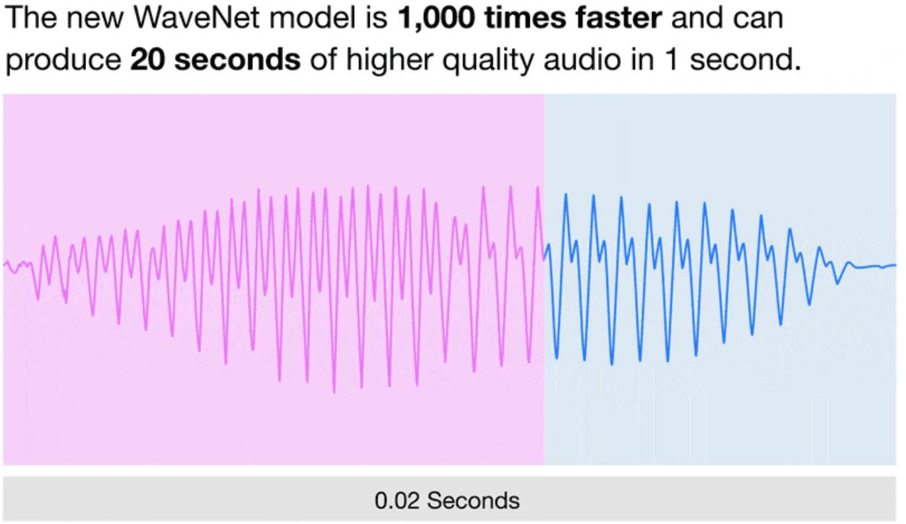 就在一年前,谷歌 DeepMind 发布了 WaveNet,这是一种新的深度神经网络,能生成新的声音信号波形,并且比起其它现有技术,其生成的语音拥有更加逼真的音效。当时这个模型还只处于研究雏形阶段,对于消费性产品而言,模型的计算消耗量太大。