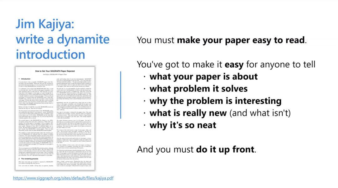 我的前同事 Jim Kajiya 是一个非常了不起的图形学专家,他最牛的地方就是基本上从来不和别人合写文章,都是自己独立完成。Jim曾经写过一篇文章“How to get your SIGGRAPH paper rejected”,文中最核心的观点是文章一定要写得易读——这篇论文是关于什么的?它解决了什么问题?迷人之处在哪?有什么新的东西(我一直强调做科研的终极问题就是 what's new,写文章的时候一定要强调文章中有什么新的东西)?巧妙之处何在?