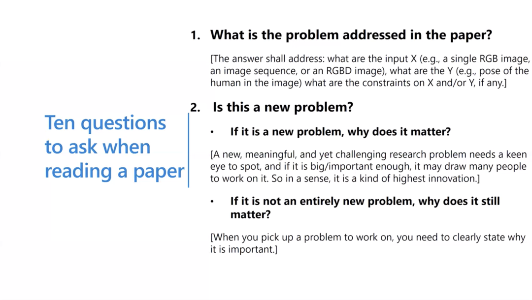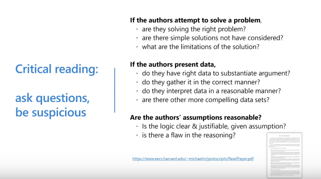 以批判性阅读开始,带着质疑的心态问问题。如果作者论文中声称解决了一个问题,那么你就要在心里问自己:论文是否正确、真正地解决了问题?作者论文中所用方法是否有局限性?如果所读的论文没有解决问题,那么我能解决么?我能采用比论文中更简单的方法解决么?所以,一旦进入仔细阅读的状态,要在读论文之前对自己说:这篇论文可能有问题,我要找出来。这就是批判性阅读。