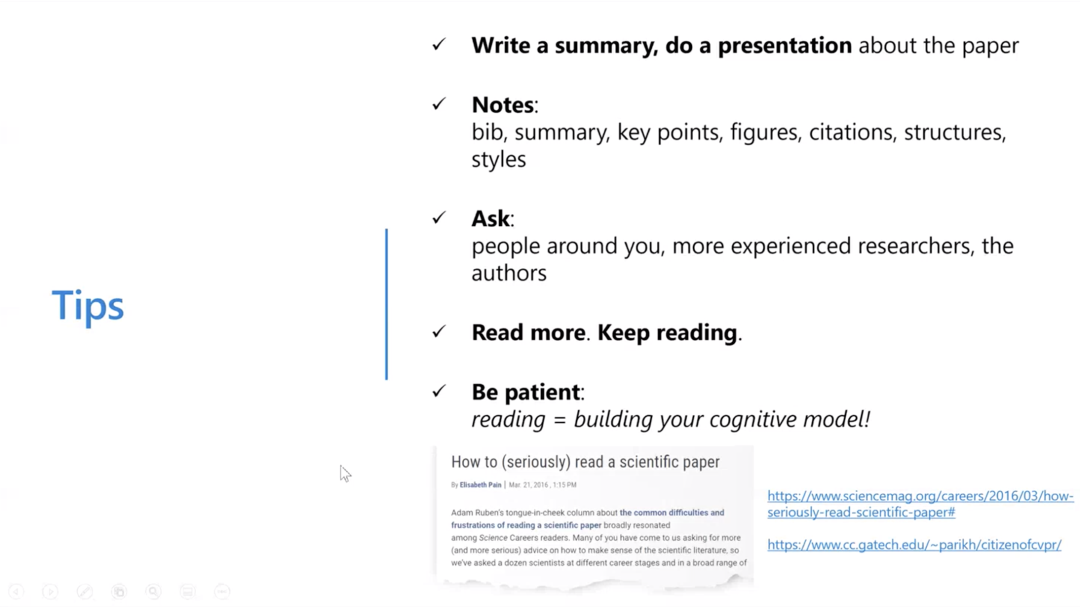 最后,我想向大家介绍几个小tips。我最想强调的是要养成写小总结的习惯,最好能做报告,这样真的能够增加你对所读论文的理解。我想再次强调,大家一定要有耐心,因为阅读就是在你大脑中建立认知模型的过程,虽然不知道今天读的文章未来什么时候能够派上用场,但是请大家保持阅读、建立认知的习惯。