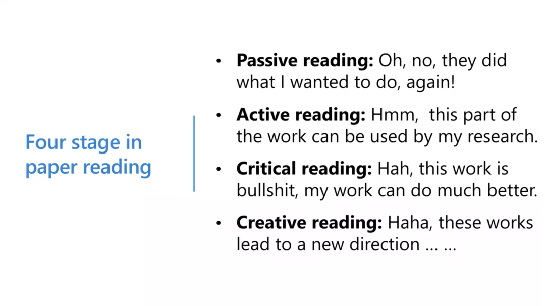 如同前面沈老师所说的,读 paper 可以分为四个阶段:消极阅读、积极阅读、批判性阅读和创造性阅读。