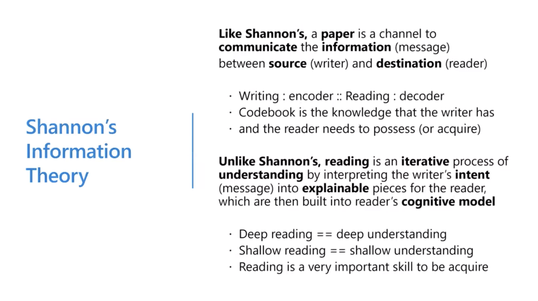 实际上,这种关系可以用香侬的信息论原理来解释——论文是作者和读者之间交流信息的渠道,主要是单向传输,信息源是作者,而目的地就是读者。写作就像编码,阅读就像解码,所以我们需要一本 Codebook 来介绍“编码”到“解码”所需要的知识,也即作者按照这本 Codebook 中的规范进行“编码”,阅读者则用它来“解码”。