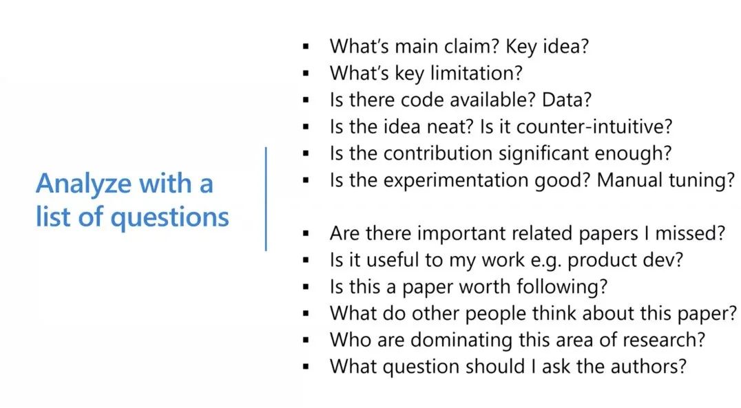 我一直觉得理解了一个东西以后,最重要的是能够自问自答,这张图片是一个总结(图片不见啦?),图片的上半部分是比较客观的问题,包括论文的核心观点是什么?主要的局限性是什么?代码和数据是不是可得的?论文的贡献是否有意义?论文中的实验是否足够好?图片的下半部分是比较主观的问题,包括我错过了什么相关论文么?这对我的工作有何帮助么?这是一篇值得关注的论文么?这个研究领域的领头人是谁呢?哪些公司、研究院、实验室值得关注?其他的人对这篇论文有何看法呢?如果有机会见到作者,我应该问作者什么问题?当你在阅读论文的时候如果能回答出上面列出的问题,我相信你会对你所读论文有非常深刻的理解。