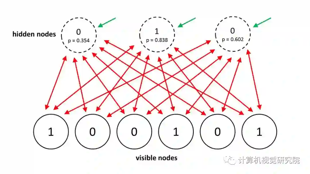 对于正相位,首先将可见单元的数据矢量钳位。然后计算所有可见和隐藏单元对的<ViHj>的确切值。对于每个连接的单元对,对小批量中的所有数据<ViHj>求平均。