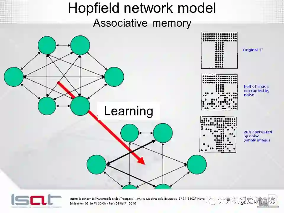 循环网络的非线性单元通常很难分析。它们可以表现为不同的方式:稳定到稳定的状态,振荡,或遵循不可预测的混沌轨迹。一个 Hopfield 网络由二元门限单元组成,它们之间有连续的连接。1982 年,John Hopfield 认识到,如果连接是对称的,就有一个全局能量函数。整个网络的每个二进制「结构」都有能量,而二进制阈值的决策规则使网络可以得到能量函数的最小值。利用这类计算的一种简洁方法是使用记忆作为神经网络的能量最小值。使用能量最小值来表示记忆从而内存可寻址。可以只知道一个项目的部分内容来访问这个项目。这对硬件损坏是极大的。