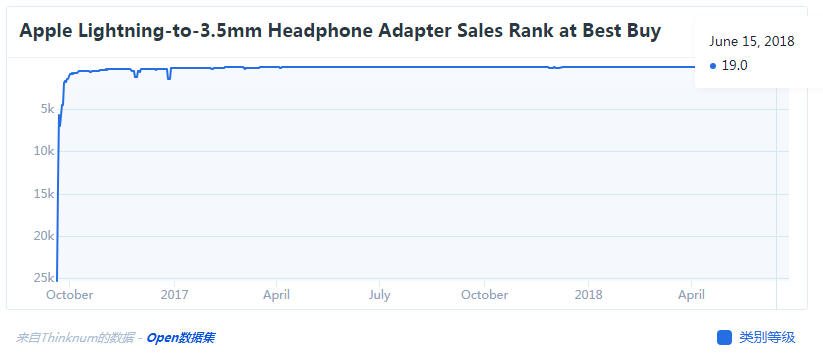 下图显示了过去几年Lightning转3.5mm耳机转接头在百思买的销售排名。正如你所看到的,在过去的一年中,转接头已经成为跻身前25名。