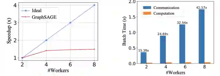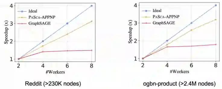 本文比较了基于 SGAP 范式建模的 PaSca-APPNP 模型以及基于 NMP 范式建模的 GraphSAGE 模型在分布式场景下的可扩展性。固定总的批处理大小并增加工作节点的数目,如图 7 所示,实验发现 PaSca-APPNP 能够获得更接近理想情况下的加速比。