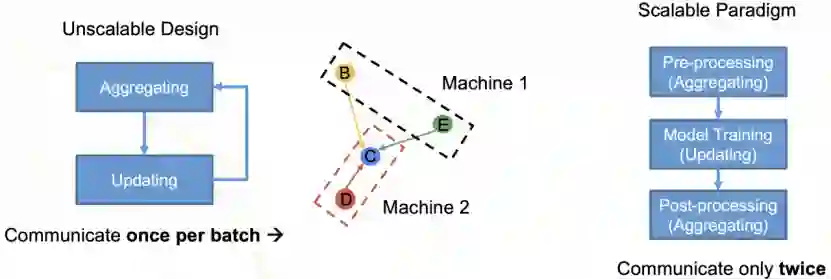 区别于现有的消息传递机制,本文提出的 Scalable Paradigm(SGAP)将消息聚合操作和更新操作分离,定义了可扩展性图神经网络建模的新范式:前处理—训练—后处理,消息聚合操作只存在于前处理和后处理中,极大地降低了分布式场景下的通信开销。