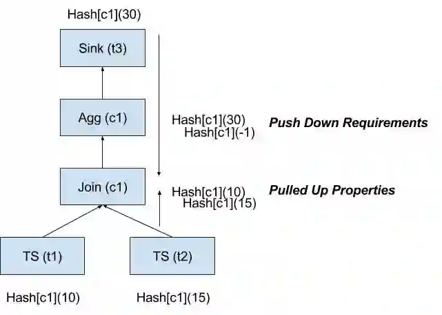 Pulled Up Property猜测并筛选可能的前序delivered property,用于在编译时减少搜索宽度。考虑上图的查询,在Join编译时,因为Sink的需求下推,它被要求提供一个Hash[c1](30)。Pulled Up Property则从前序操作猜测可能会提供Hash[c1](10)和Hash[c1](15),综合考虑,Join可能会直接要求Hash[c1](30),从而减少了Hash[c1](10)和Hash[c1](15)这两个分支。