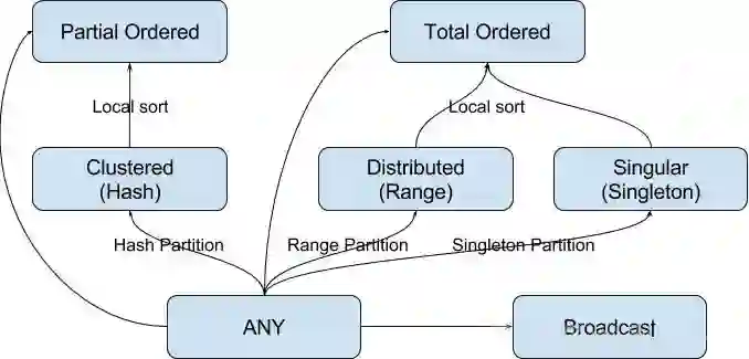 算法的副作用:每个分布式算法可能产生一次运行时数据分布。例如,sorted merge join可以保证它的输出数据满足按join key的有序和哈希分布的特征。