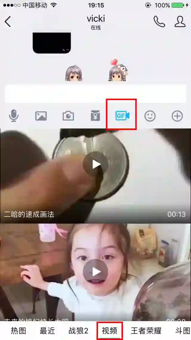 进入聊天界面,点击菜单栏中GIF图标,在底部选择视频即可