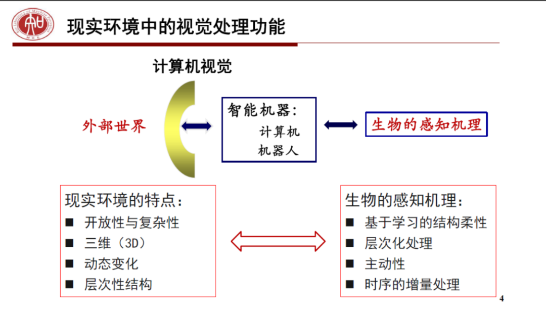 那么现实环境中的视觉处理应该考虑哪些因素呢?我们有计算机、机器人这些智能机器,同时还有其它两个关键的部分。第一个部分是要通过视觉这个接口来同外部世界建立联系,同环境进行互动;第二个是我们讲视觉的时候,生物的感知机理给我们提供了很多依据。这其中,我们要应对的是现实环境的开放性,以及三维世界的复杂性,我们要面对场景当中很多动态的变化以及层次性结构的多样性。