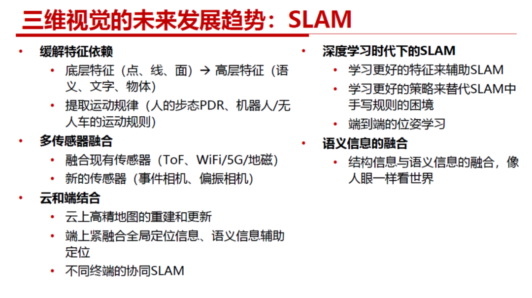 有一个趋势是朝着多传感器融合的方向发展,其实每个传感器都有着它的优点和缺点,那么最好的方法就是把这些传感器的信息都融合起来,比如说随着深度相机的流行,一些手机上都安装了深度摄像头,还有Wifi、蓝牙、地磁信号等等,把这些信号都融合起来肯定可以提升定位的稳定性。未来还会有更多类型的传感器出现,比如这几年新出来的事件相机、偏振相机,相信未来5-10年还会有一些新的传感器出来。通过多传感器融合,我相信SLAM技术会做的越来越精准和鲁棒。