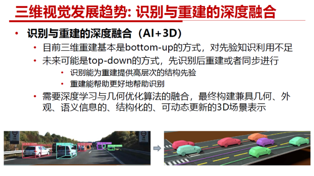 然后,我想谈一下识别和重建的关系。识别和重建未来5到10年会往更深层次的融合。目前三维重建基本上是bottom-up的方式,对先验知识的利用不够充分,未来5-10年可能会诞生top-down的方式,比如说先识别后重建,或者两者同步进行。识别能够提供更高层次的结构先验,反过来重建能够帮助做更好的物体识别,因此未来会更加紧密的融合。另外,也还需要深度学习和几何优化算法的融合,才能最终构建出兼具几何外观、语义信息、结构化的、可动态更新的3D场景表示。