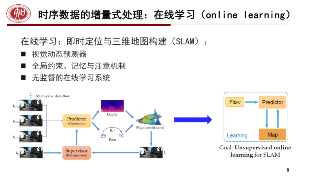 如果我们把前面提到的时序与动态处理等结合起来之后,应该更多考虑在线学习。我们不应该全部依赖目前这种离线学习、仅使用标注数据,而是应该在动态的环境当中,根据运动与动态数据流本身的特性来做预测与学习。这样可以把前面提到的记忆与注意力等一些机制结合起来,最终实现一种无监督的在线学习系统。这样一来就能把现实环境中的一些特点与变化考虑进来,形成一套新的理论。而这个理论,跟现在的深度学习、图像处理分析与理解等相比,会更接近我们讲的视觉这个概念。