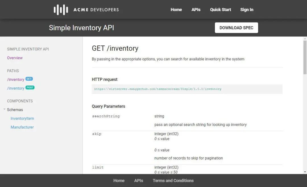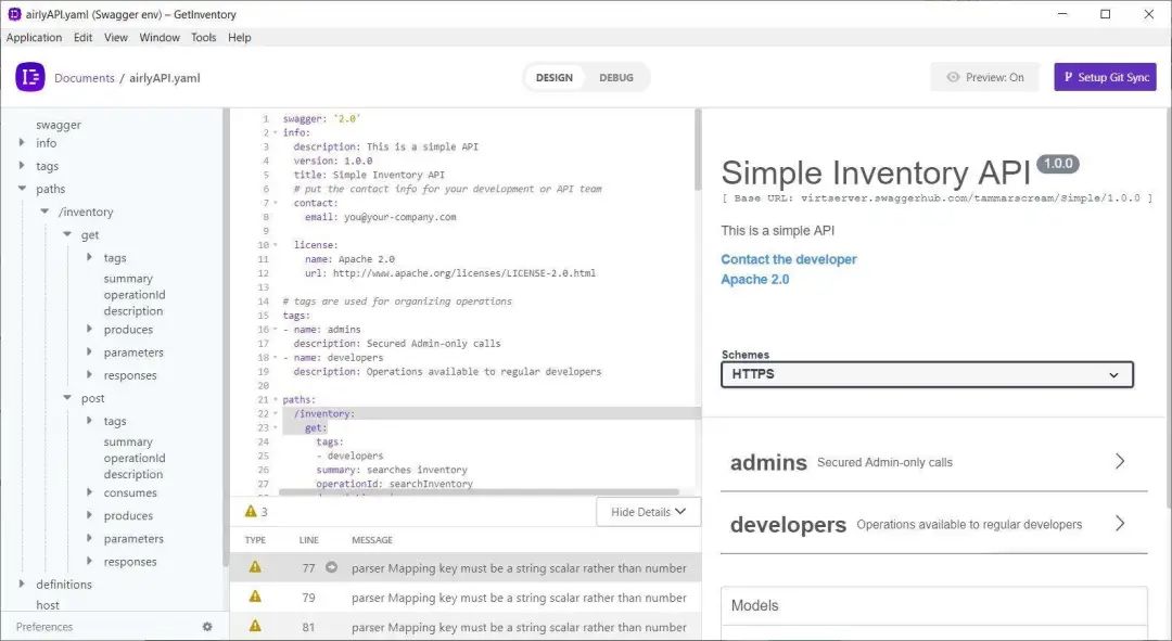 Insomnia 是一个桌面应用,可以使用 Git sync 选项调试 API 规范。“设计”部分提供带有详细错误消息的样式验证。自动生成的预览与 Swagger Editor 很像。在“调试”部分,你可以使用以下方法修改 API: