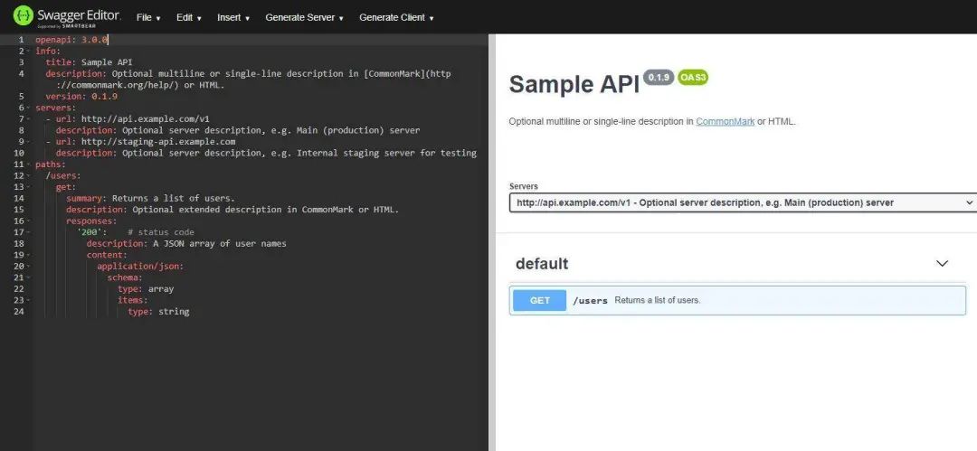 Swagger Editor 是图形可视化的流行选项。你可以使用 JSON 或 YAML 定义 API。此外,你可以为大多数相关技术(从 ASP.NET Core 和 Kotlin 到 Node.JS 和 Python)生成服务端或客户端存根。