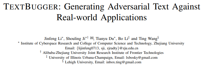 TextBugger: Generating Adversarial Text Against Real-world Applications
