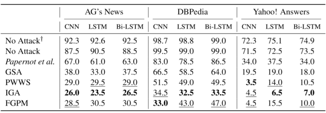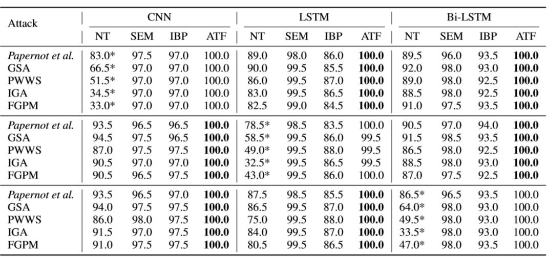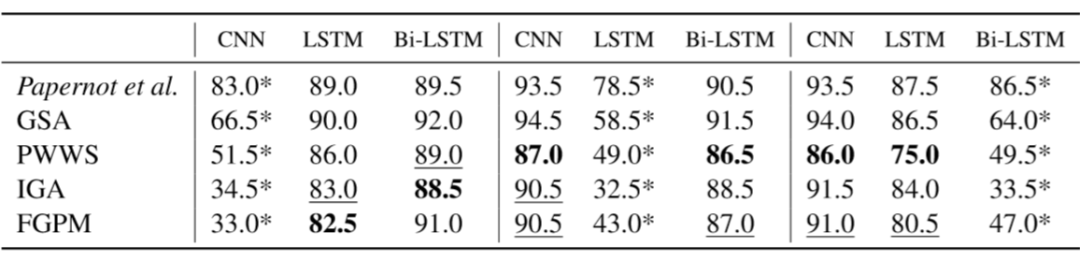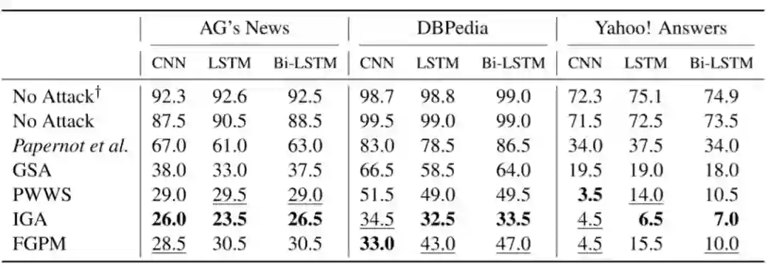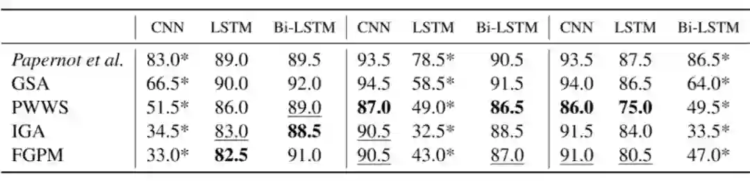 FGPM 具有一定的攻击性能和可转移性,同时比目前最快的文本攻击方法快 20 倍左右(时间上的统计)。作者还将通过 FGPM 生成的对抗样本与对抗训练结合起来作为一种模型防御的手段,并扩展到大型神经网络和数据集。