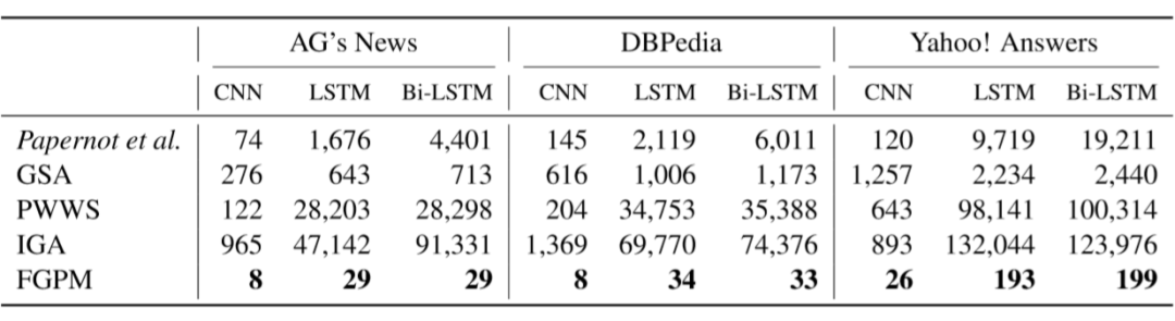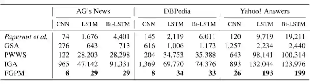 文本对抗样本中攻击效率对于评估攻击方法也很重要,尤其是当将攻击作为一种防御方法纳入对抗训练时。