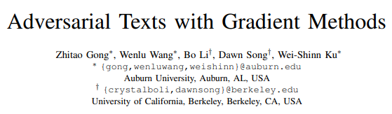 本文是关于文本类对抗样本的生成的文章。要清楚的是由于图片和文本数据内在的不同,用于图像的对抗攻击方法无法直接应用于文本数据上。