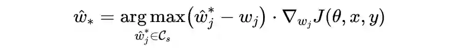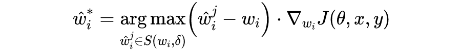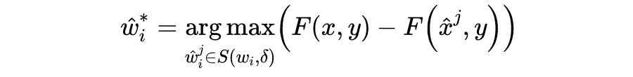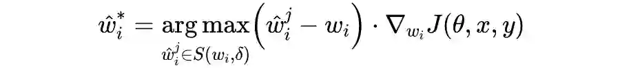 其中 。选择过程是非常耗时的,为了降低基于深度模型的计算复杂度,本文作者利用梯度的大小与词嵌入空间中两个同义词在梯度方向上的投影距离的乘积来估计变化量,从而得到分类置信度。
