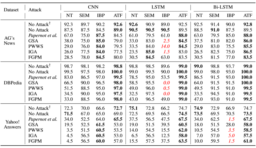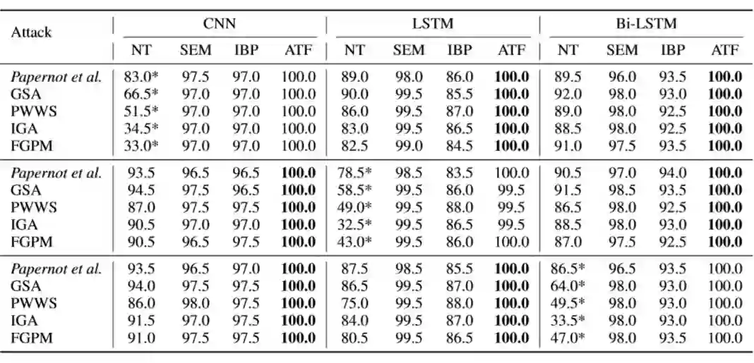 对于句子级别的攻击,通常是基于转述这样会使得对手生成需要更长的时间。综上所述,文本类的攻击要么面临基于梯度的扰动的语义保持质量的挑战,要么是基于查询的同义词替换的高计算量的成本。