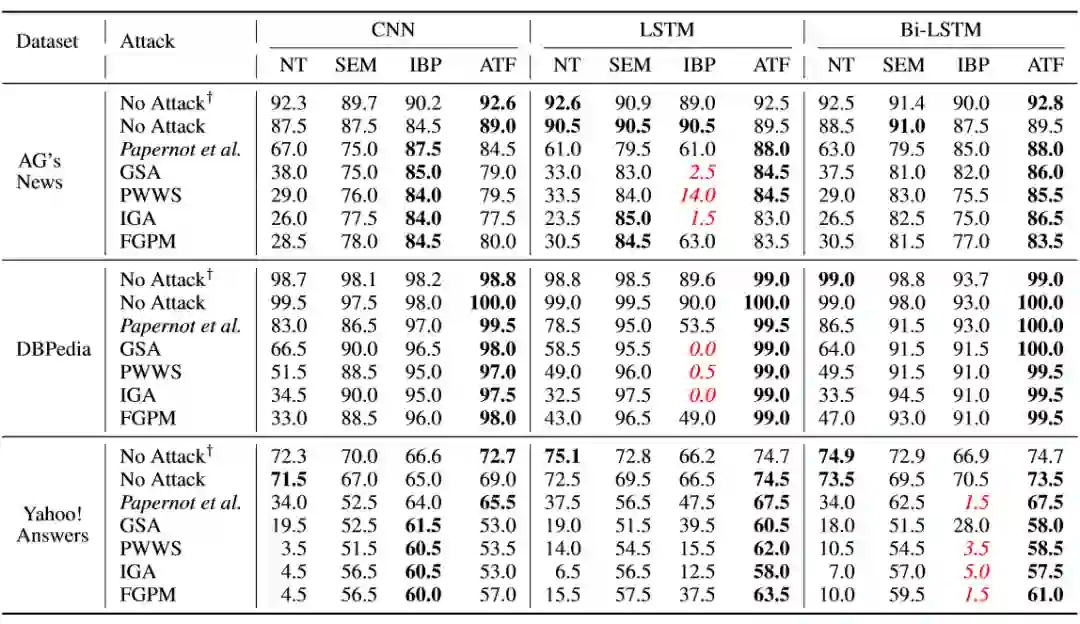 为了评估各模型对敌方示例可转移性的阻断能力,作者在 DBPedia 上正常训练的情况下,对不同攻击方法生成的对抗样本进行分类精度评估。