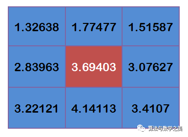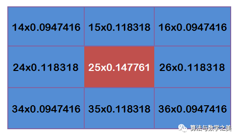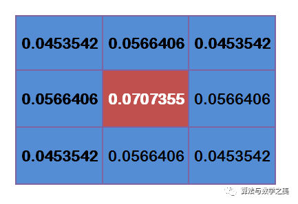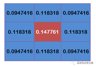 这9个点的权重总和等于0.4787147,如果只计算这9个点的加权平均,还必须让它们的权重之和等于1,因此上面9个值还要分别除以0.4787147,得到最终的权重矩阵。