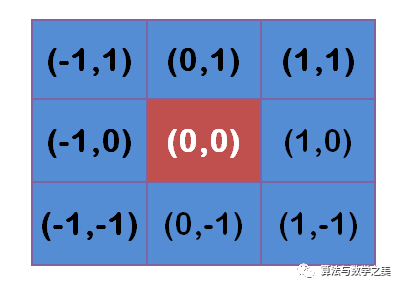 假定中心点的坐标是(0,0),那么距离它最近的8个点的坐标如下: