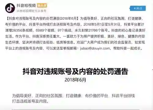6月11日消息,抖音今日发布对违规账号及内容的处罚通告,2018年5月1日至5月31日,抖音平台累计清理26356条视频,6989个音频,91个挑战,永久封禁21786个账号。