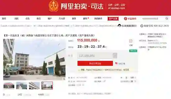 同时,河南新飞电器有限公司名下位于河南省新乡市牧野区北干道370号、胜利路南段309号等地块的部分土地、房产以及建筑物也将于2018年7月5日10时至7月6日10时,在河南省新乡市中级人民法院淘宝网司法拍卖网络平台上进行公开拍卖。相关标的拍卖起拍价为1.15亿元,保证金为2000万元,增价幅度不低于500万元。(第一财经)