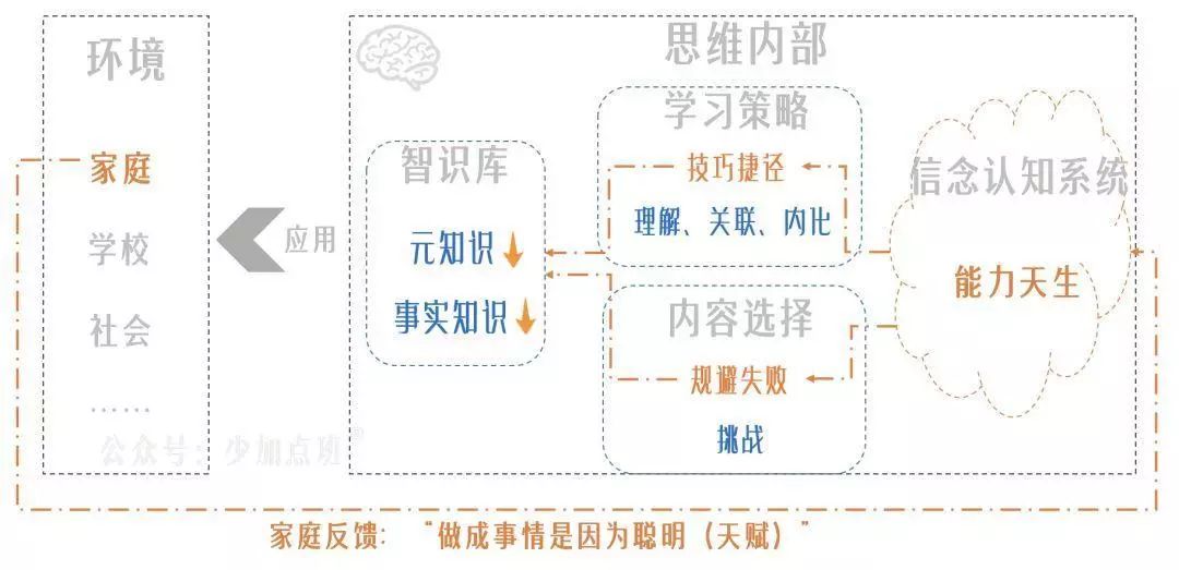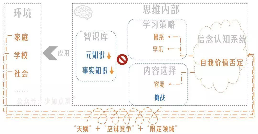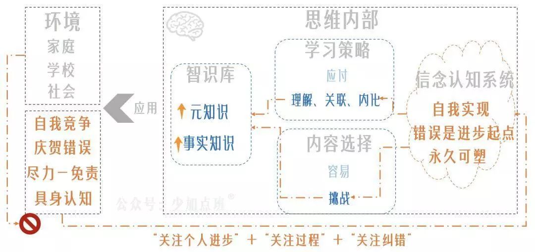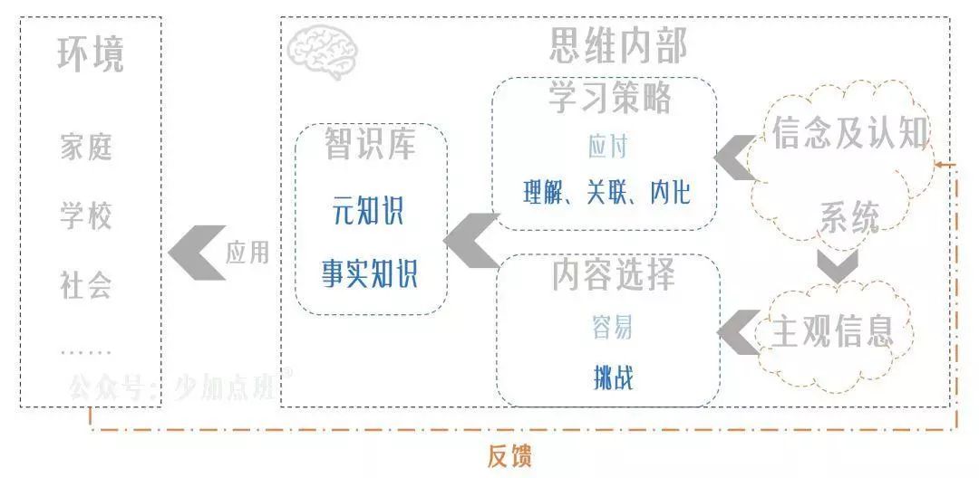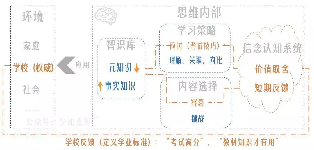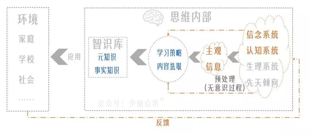 我们的学习策略、学习内容选择又受制于“信念及认知系统”;“信念及认知系统”则取决于我们将“智识库”应用于环境后的“反馈”(橙色字体),即“反馈”是否达成我们的期望。